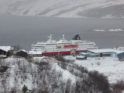Near to Hammerfest, we passed the island of Melkoya, which is a bulk gas storage and distribution facility, interesting in some respects. But, the hearty coffee given on the snow covered deck as we passed it by allowed enjoyment of a wonderful sky as the sun dropped behind the clouds. It was bitterly cold because of the wind, but the thick coffee (with cinnamon and ?) certainly hit the spot!
